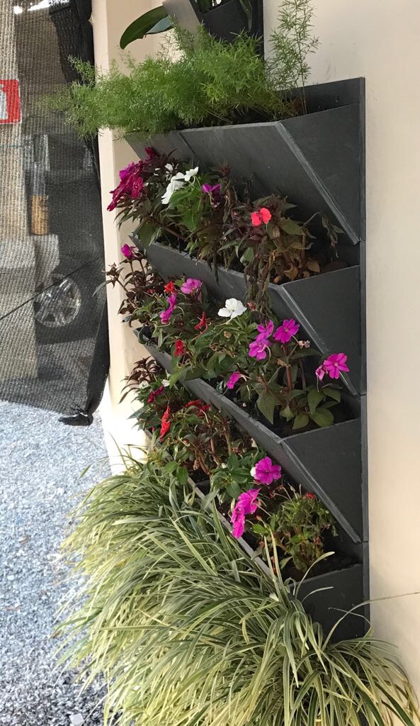 Alignées, décalées ou en accumulation pour habiller complètement un mur et donner du relief à vos extérieurs. Les teintes sombres mettent particulièrement en valeur les fleurs, qu’elles soient colorées, retombantes ou même aromatiques.